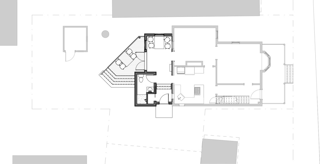 In addition to providing a second bathroom for the house, the expansion of the first floor of the building includes an improved entryway from the parking area, a sitting room for breakfasts and reading, and an improved outdoor deck with better access to the yard and garden space.