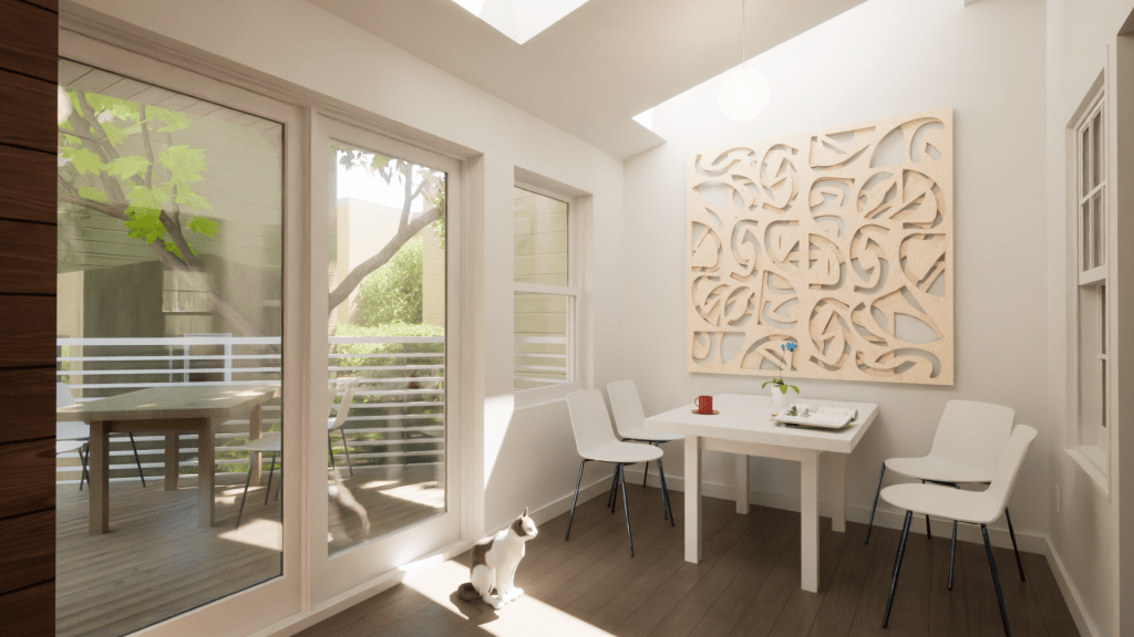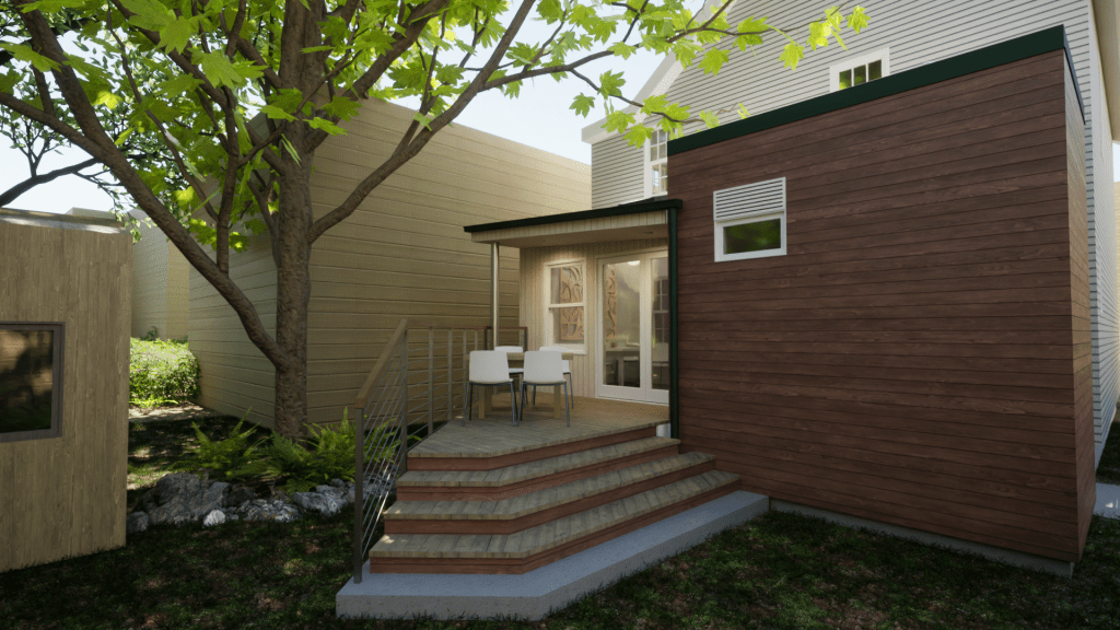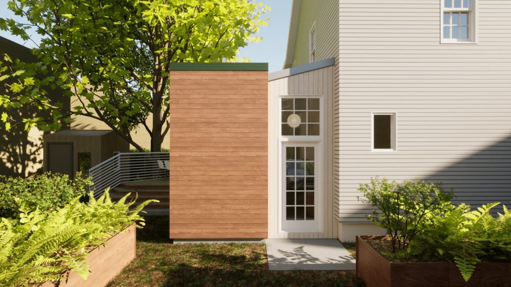 The layout of the project was influenced by the idea of preserving the 28 inch Norway Maple that provides to the property a valuable canopy. This results in a set of defined spaces that yields an unobstructed passageway from the parking area and an uninterrupted deck space outdoors.